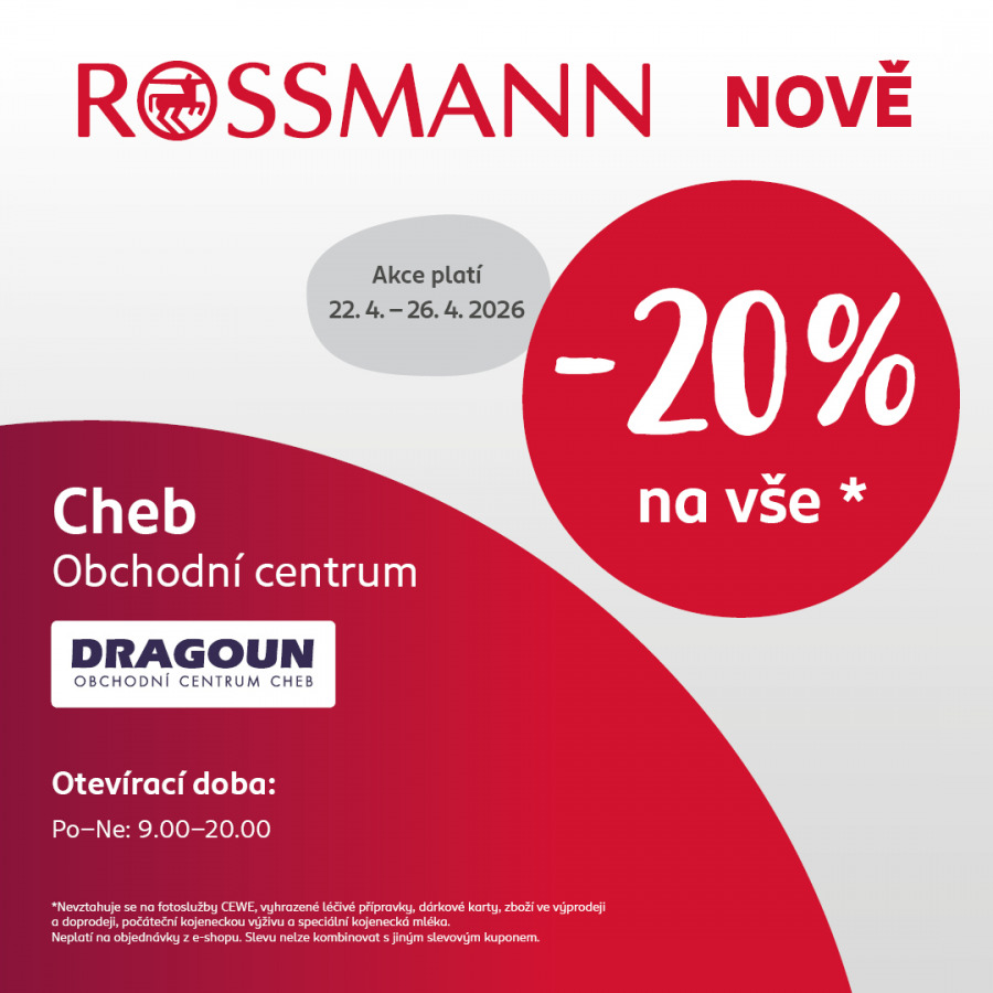 Abychom příchod nového nájemce náležitě oslavili, připravili jsme pro vás ve spolupráci s prodejnou ROSSMANN exkluzivní akci. V období od 22. 4. do 26. 4. 2026 získáte při nákupu v nové pobočce slevu 20 % na vše*.